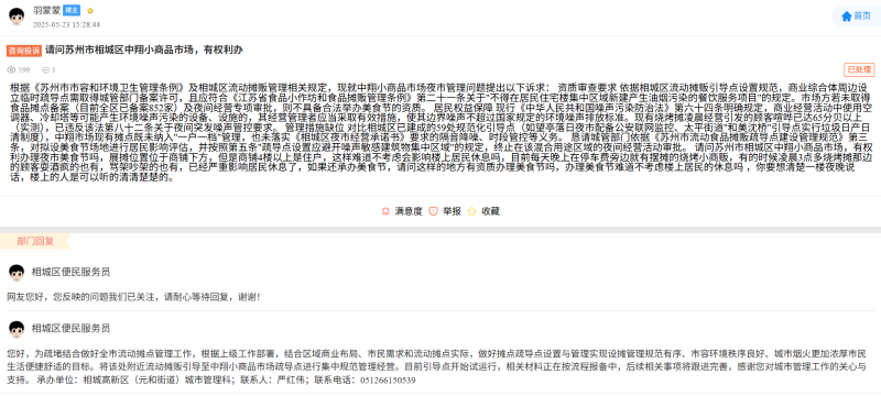 记者看到,在12345和“寒山闻钟”等平台上,也有不少居民公开反映过该问题。针对居民长达半年的投诉,相城高新区(元和街道)城市管理科的回复大同小异,表示会“加强引导”和“规范摊贩营业时间”,不过实际上并没有什么改善。