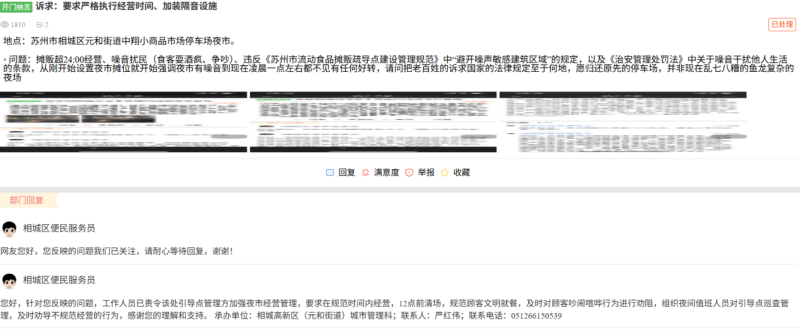 3月11日,苏州市相城区元和街道集成指挥中心回复,由于相城大道周边流动摊贩占道经营现象较为突出,存在一定安全隐患。元和街道经沟通协调,于2025年5月在相城大道中翔小商品市场停车场设置夜市引导点,明确经营时间为17:00至24:00。但运营期间,部分摊点未遵守经营规定,超时经营、噪声扰民问题频发。尽管街道工作人员多次上门沟通,仍有部分摊点违规经营至凌晨两三点。