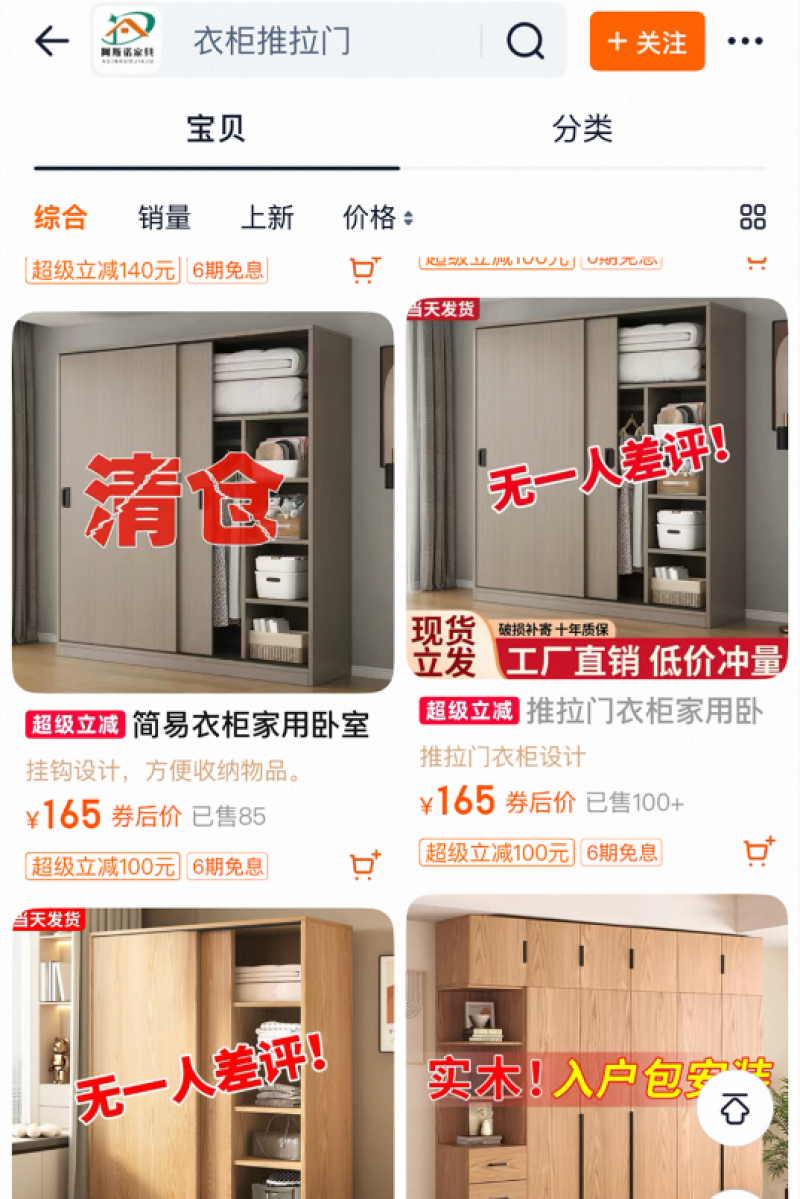 记者浏览该店铺时注意到,组装柜子的价格在165元-580多元不等。商家打出“无一差评”的宣传口号,并宣称“整柜加厚E1级健康环保板材,防潮防霉不变形,拒绝异味”“质保10年”。然而,记者打开评论区浏览时看到不少差评。