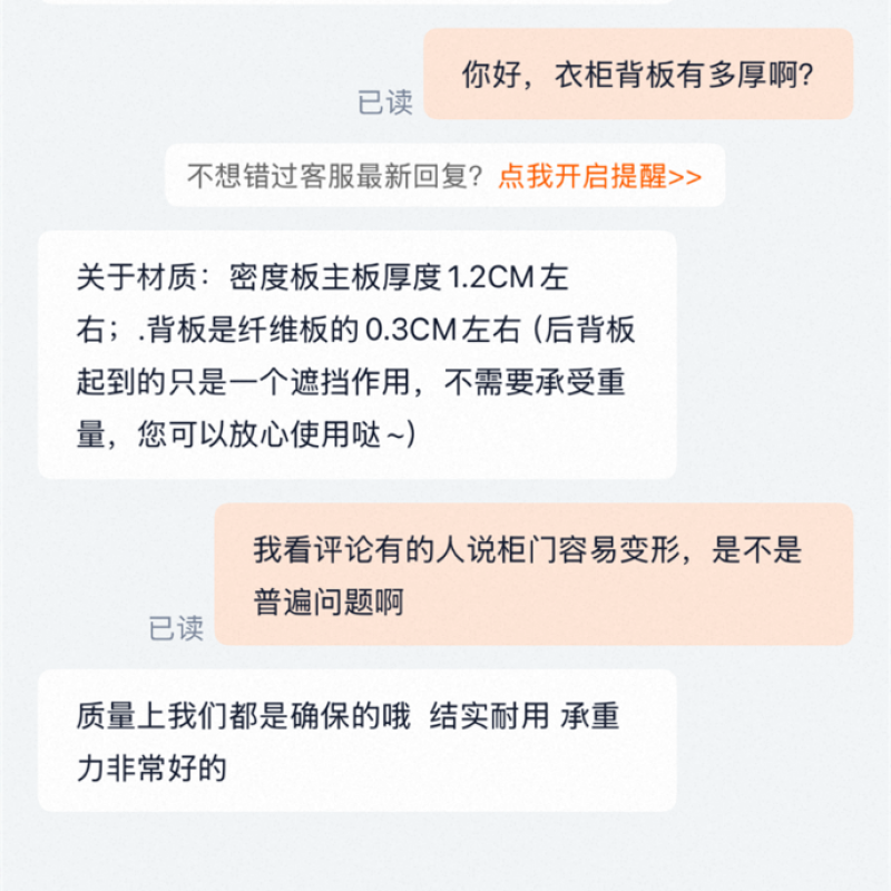 记者向该店铺客服进行了咨询。客服依旧表示,背板厚度在0.3厘米左右。“后背板起到的只是一个遮挡作用,不需要承受重量,您可以放心使用。”