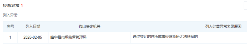 记者注意到,今年2月5日,该公司因“通过登记的住所或者经营场所无法联系”,被睢宁县市场监督管理局列入经营异常名录。