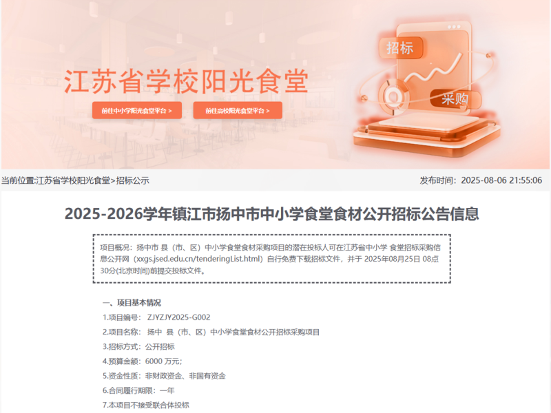 据了解,通过江苏中小学阳光食堂平台,学校食堂食材实施线上统一招标采购,中标的实际供应商为招标人所在地区的所有中小学配送食材。