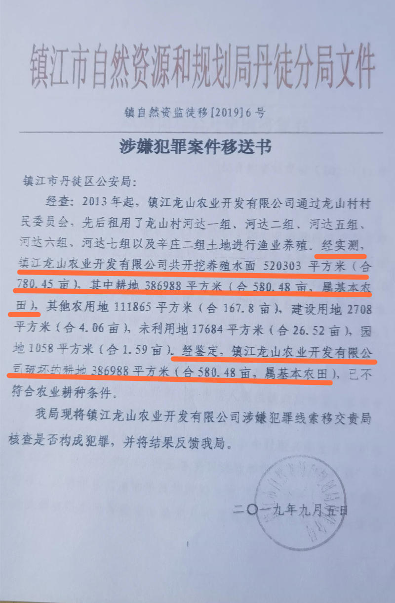 同时,他还拿到了该局2019年移交给丹徒区公安局的《涉嫌犯罪案件移送书》。具体内容为:经实测,镇江龙山农业开发有限公司合计开挖鱼塘780.45亩,包括580.48亩基本农田。经鉴定,镇江龙山农业开发有限公司破坏耕地,已不符合农业耕种条件。现将镇江龙山农业开发有限公司涉嫌犯罪线索移交贵局核查是否构成犯罪。
