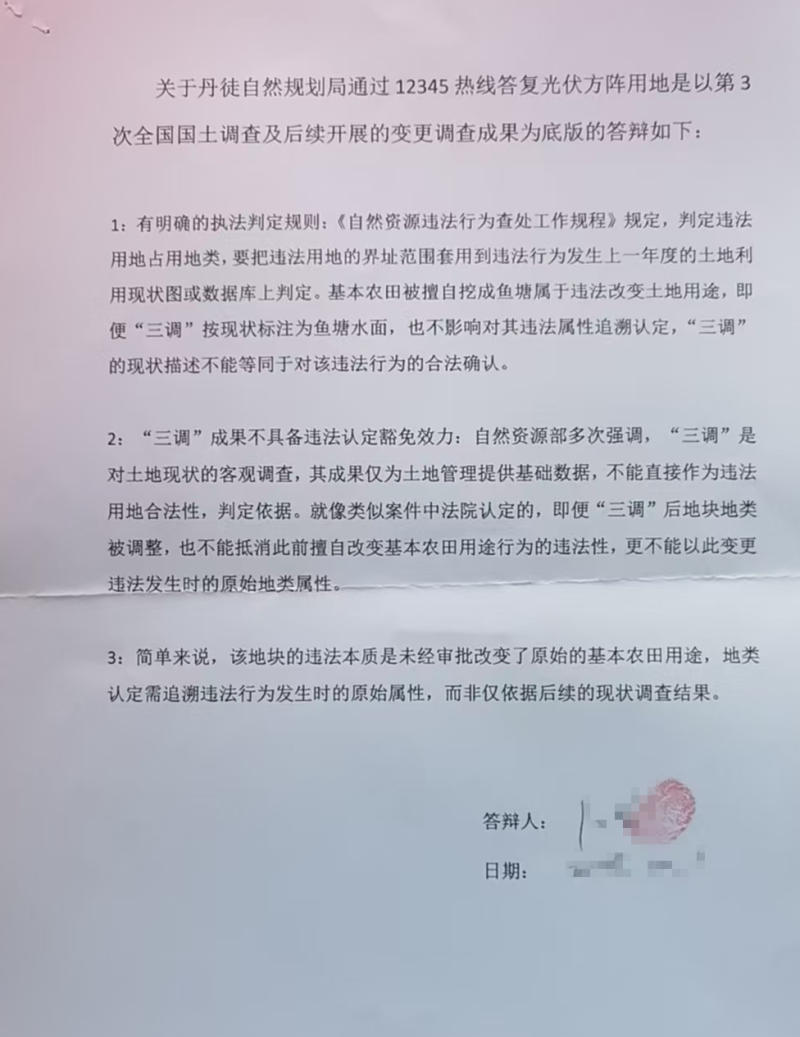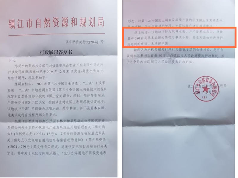 2025年12月,卜先生向丹徒区自然资源和规划局提交行政处罚申请,要求处罚镇江龙山农业开发有限公司。2026年2月27日,该局予以书面答复:经调查核实,该地块“三调”已调查为坑塘水面,是非耕地,并不是基本农田,要求对镇江龙山农业开发有限公司进行行政处罚的事项,无法律依据。