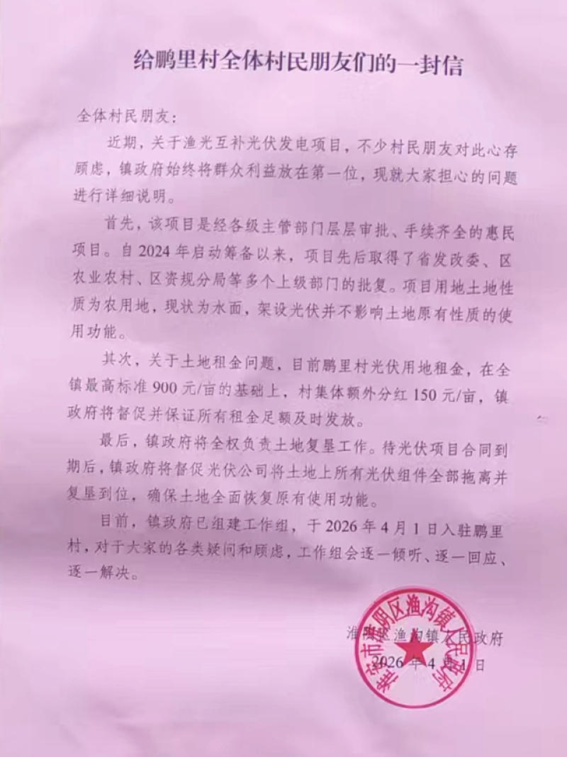 针对村民们的担忧,2026年4月4日,渔沟镇政府回应了村民关切,表示该项目自2024年启动筹备以来,经过了各级主管部门层层审批,手续齐全。项目用地土地性质为农用地,现状为水面,架设光伏并不影响土地原有性质的使用功能。待光伏项目合同到期后,镇政府将督促光伏公司将土地上所有光伏组件全部拖离并复垦到位,确保土地全面恢复原有使用功能。