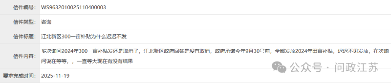 网友:南京市民杨先生咨询,南京江北新区长芦街道2024年耕地保护补贴何时发放?此前,街道表示,这项补贴将于2025年9月30日前发放完毕。然而,至今都没有发放。